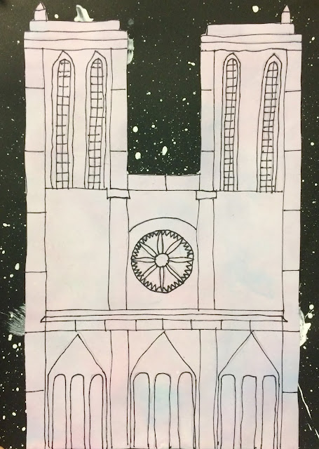 Fourth and Fifth grade students studied the history of Notre Dame and key aspects of French Gothic architecture. A few students had visited the Paris landmark and shared their experiences. We created the painted backgrounds with splatter paint stars and a wet on wet watercolor technique. Using a line drawing of the cathedral as a starting point for design, students added in their own styles and ornate details. They all did an excellent job!
