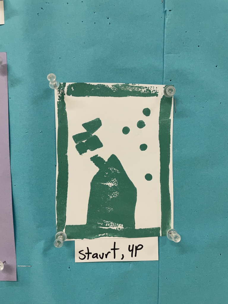 I have always wanted to try printing white ink on a contrasting darker paper.  In December, 4th and 5th grade tried this technique with winter printmaking.  First, they each designed a unique foam stamp.  We used foam dots to make a fun snow effect.  Next, they printed with white ink on black, blue or purple paper.  Finally, we switched to white paper and color ink for a printmaking extravaganza!  Each student had a chance to print as many as they wanted to with white and color inks to create cool artworks plus, holiday gifts.  I think the prints would make a neat postcard as well.  The whole project turned out to be really fun and students had an excellent time.  It was a great way to practice printmaking and learn about local art history by adding in a quick video about the Folly Cove Designers. I will defiantly continue to teach this project!