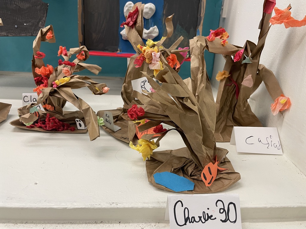 Creating sculptures using paper bags, third grade students made Fall trees. Students choose the theme of the tree and molded a paper bag into a 3D tree. They thought about proportion and design while adding objects to the paper sculpture. I love all their creative ideas!